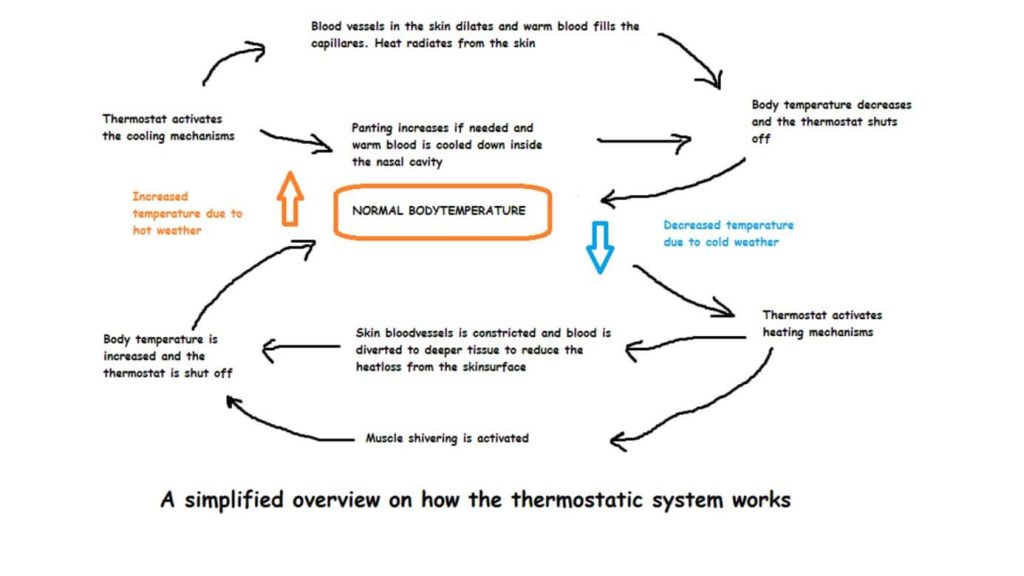 The body has an advanced system that is in charge 24/7 to keep the core temperature at the correct level. For dogs, this level is 38.5 ( +-0.5 ). When the temperature goes above or below that level, the system kicks in to restore it to the correct level – more or less like your average thermostat in your boiler system or AC unit.